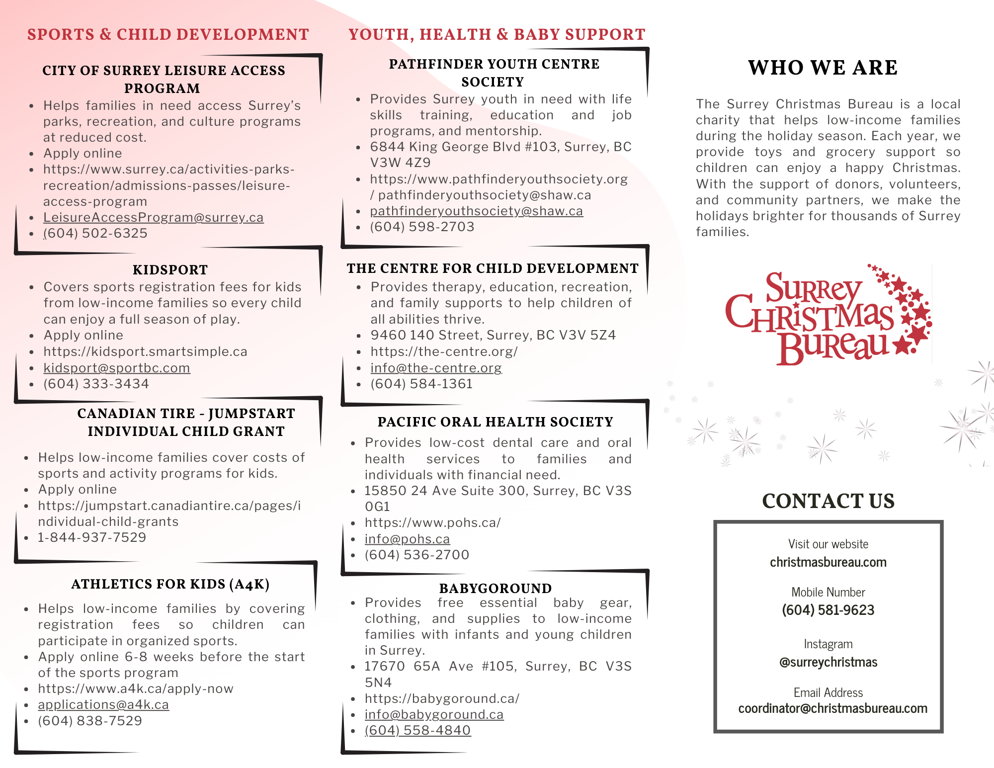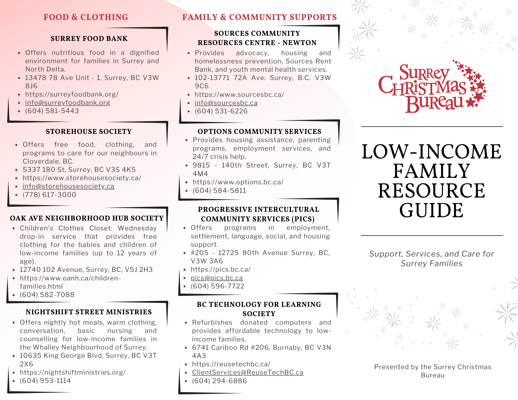 The Surrey Christmas Bureau is committed to supporting families beyond the holiday season. Our Additional Resources page provides a carefully curated list of community organizations offering essential services such as food, clothing, housing support, healthcare, technology, and children’s programs. These resources are designed to help low-income families access year-round assistance and build stability.