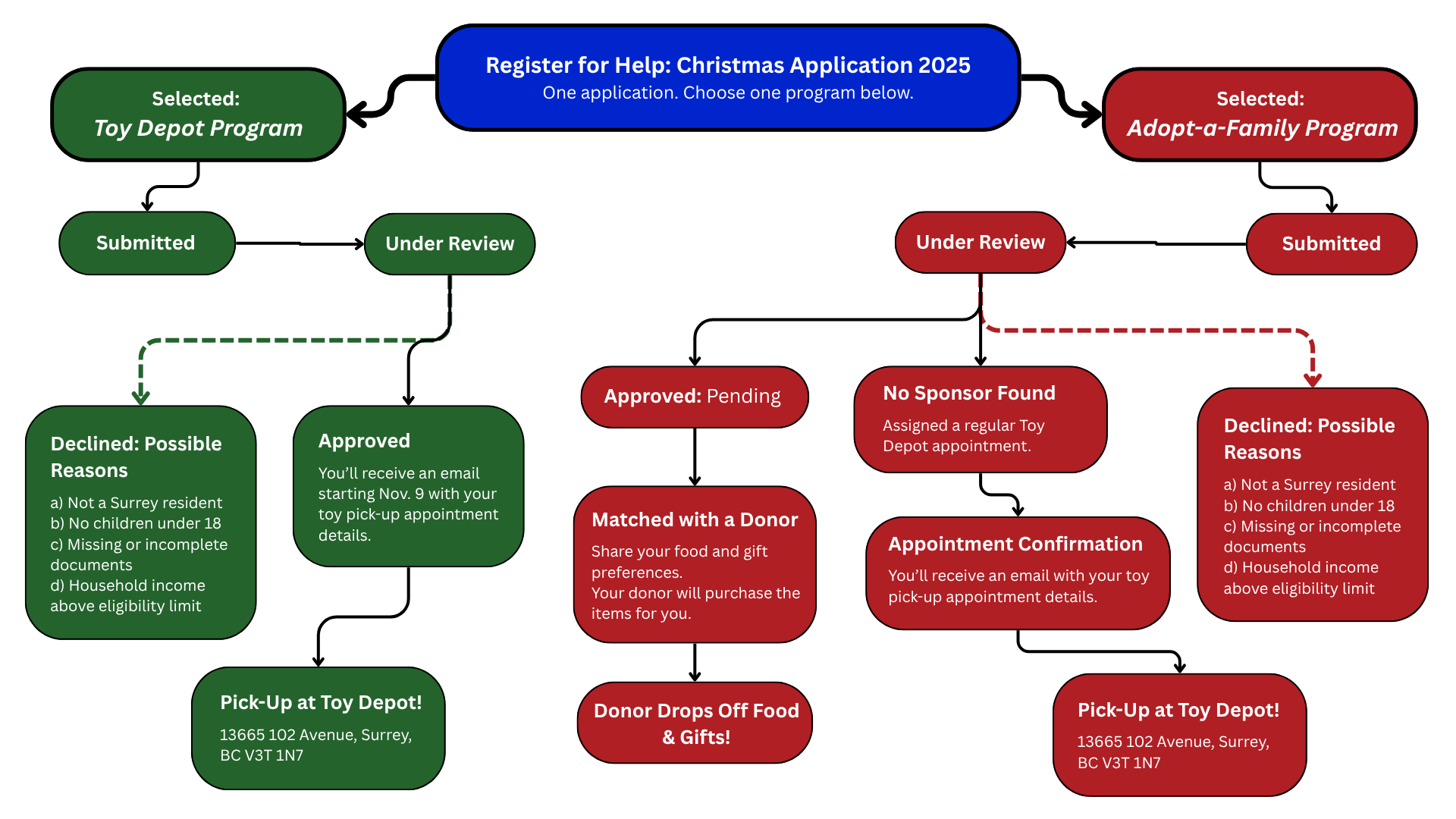 If your application is approved, and you are not participating in the Adopt-a-Family program, your approval email will include a link to a calendar where you can book a pickup appointment at the Toy Depot to: